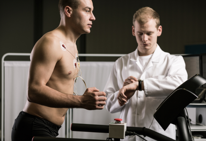ECG, heart rate and blood pressure recording during treadmill exercise test.